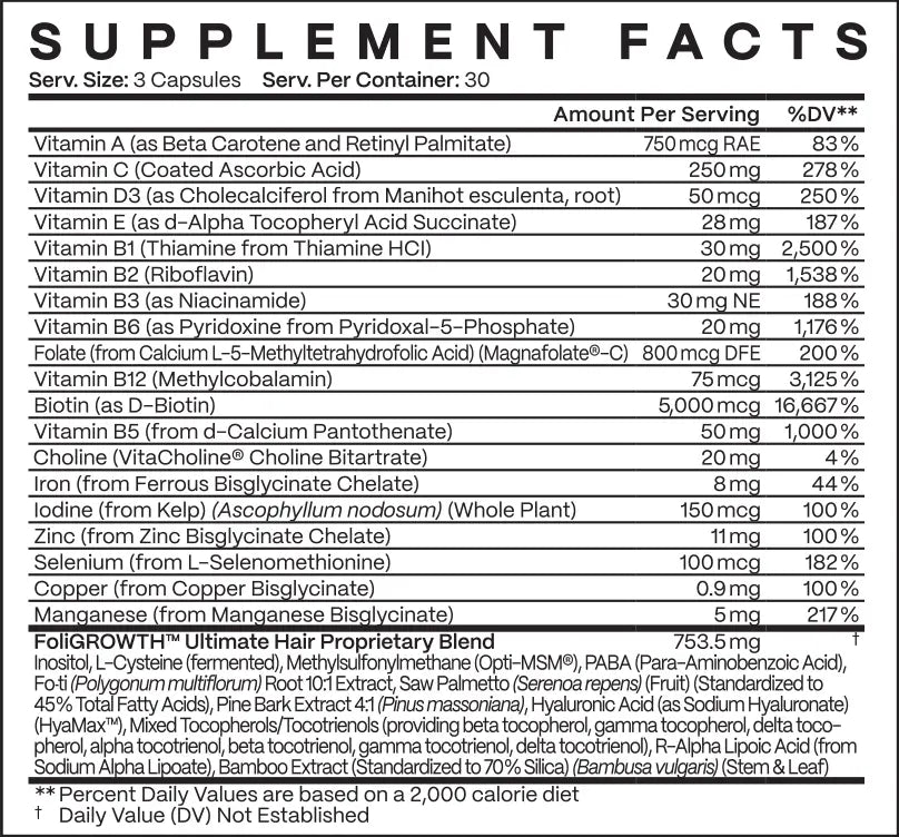 A patented, all-natural formula, Foligrowth fills nutritional gaps, while supporting thyroid and adrenal function. A therapeutic serving size of vitamins A, C, D, and E help protect and strengthen follicles and reduce shedding. B-vitamins, including ingredients like folate, B6, and B12, fuel keratin production and support strong, healthy hair fibers. A clinically backed supplement for vitalized, sustained hair growth over time.