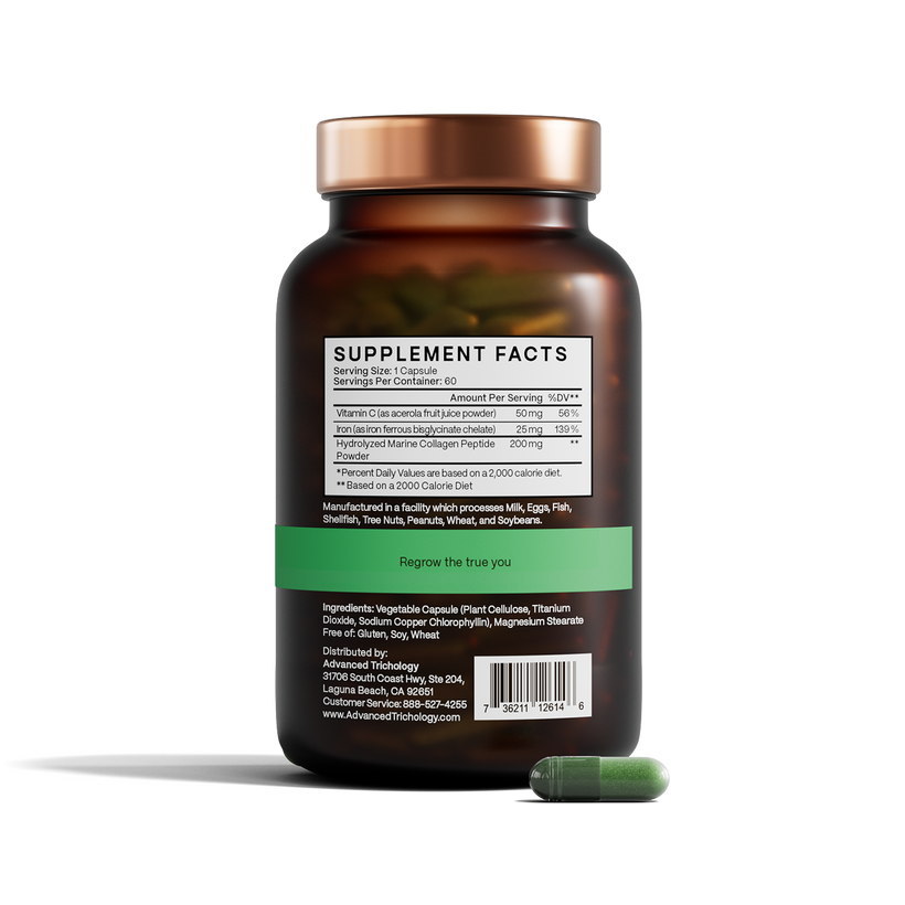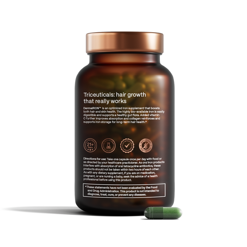 A natural iron supplement in a therapeutic serving size, DermaIRON™ is gentle on the gut and supports healthy flora without side effects. Vitamin C supports high absorption, while marine collagen peptides support follicle microenvironments and growth cycles. A science-backed supplement for long-term support of hair and skin health.