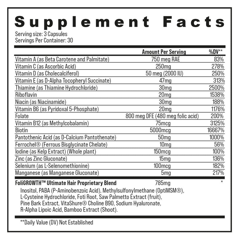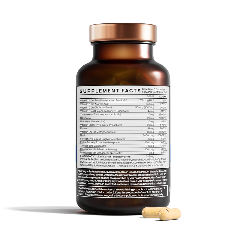 A patented, all-natural formula, Foligrowth fills nutritional gaps, while supporting thyroid and adrenal function. A therapeutic serving size of vitamins A, C, D, and E help protect and strengthen follicles and reduce shedding. B-vitamins, including ingredients like folate, B6, and B12, fuel keratin production and support strong, healthy hair fibers. A clinically backed supplement for vitalized, sustained hair growth over time.