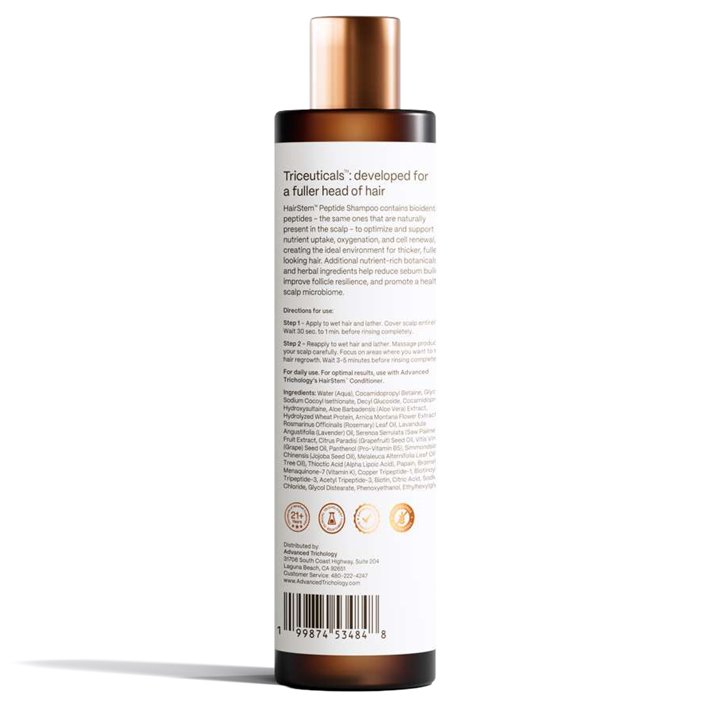 HairStem™ Peptide Shampoo contains bioidentical peptides – the same ones that are naturally present in the scalp – to optimize and support nutrient uptake, oxygenation, and cell renewal, creating the ideal environment for thicker, fuller looking hair. Additional nutrient-rich botanicalsand herbal ingredients help reduce sebum buildup, improve follicle resilience, and promote a healthy scalp microbiome.